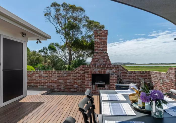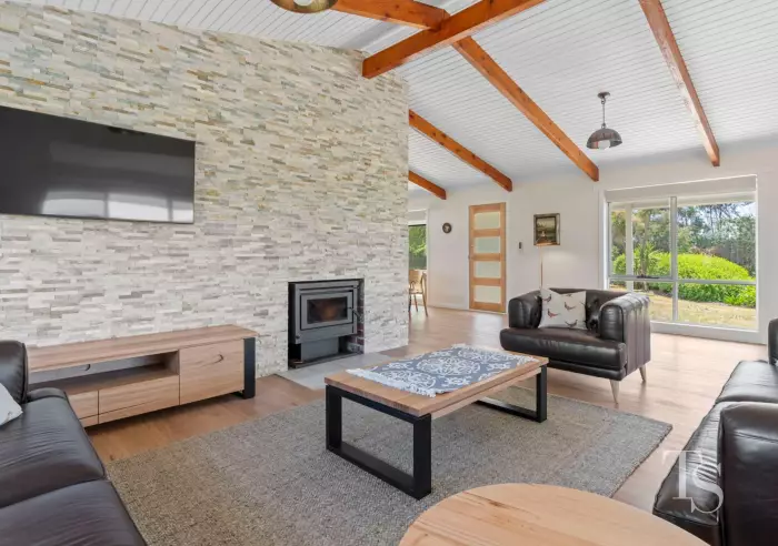 The kitchen is a standout feature, complete with a generous butler's pantry offering ample storage space. It boasts a premium Belling oven and seamlessly flows into the open dining area and lounge room, which features a wood heater and a striking stacked stone feature wall. Double glass sliding doors open to a large deck, complete with a built-in fire pit, perfect for entertaining while you enjoy the stunning view to the river.